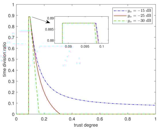 Figure 5 and Figure 6 are operated on the conditions that the channel gain is equal to −35 dB and the transmit power is equal to 0.1 W, 0.5 W and 0.9 W, respectively. The variation trends of the time division ratio and the relay interference power concerning trust degree in Figure 5 and Figure 6 are almost the same as in Figure 3 and Figure 4, respectively. By combining Equations (17) and (18), there are some conclusions drawn as follows. When the eavesdropping channel is small, the relay with a high trust degree still needs to send interference power to degrade the eavesdropping capacity. Therefore, with the decrease of the transmission power, the capacity gap between the legitimate channel and the eavesdropping one becomes smaller. The relay needs to enlarge the charging time and interference power to keep the capacity gap larger than the achievable security capacity .