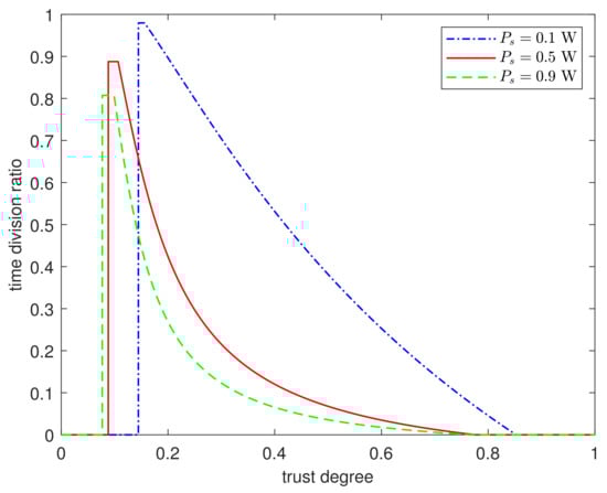 In this section, we present simulations to evaluate the performance and characteristics of the proposed methods. We assume that the additive white Gaussian noise at the relays, receiver, and eavesdroppers is equal, and its value is −40 dB. Set the energy conversion efficiency and the confidential information rate threshold to bit/s. Due to some factors, such as the efficiency of the power amplifier and the transmission loss in SWIPT energy reception, the energy conversion efficiency cannot be obtained for 100%. In addition, the confidential information rate threshold is set as 0.5 bit/s as a typical example of the confidential information rate (normalized information achievable rate), which is commonly used in the SWIPT experiment on our simulation occasions. Then, the aforementioned parameters are chosen properly to perform the simulations and validation of the proposed trust-degree-based secure relay selection in SWIPT-enabled relay networks. Finally, we simulate the time division ratio and the relay interference power concerning different trust degrees under distinct transmission power and channel conditions, respectively.