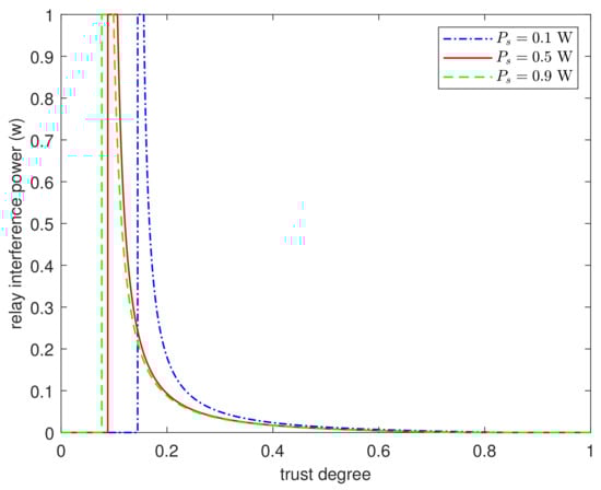 In (14), the appropriate relay and the time division ratio are chosen to optimize the interference power on the condition of considering the secure transmission and trust degree, and it is mainly implemented by the time division ratio and relay interference power with respect to trust degree. Then, the different results are analyzed for different trust degrees, and the set of trust degrees are found to guarantee the security communications. Finally, according to the different trust degrees, the required interference power is simulated and analyzed for each relay and make a selection.