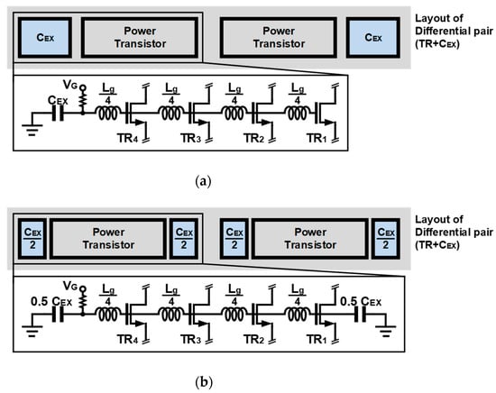 The proposed three-stacked PA with the split external gate capacitor was designed. In general, an external gate capacitor is located on the one side of the power transistor, as shown in Figure 7a. However, as shown in the simplified equivalent circuit of Figure 7a, because of the parasitic components of the metal lines for the power transistor, the effect of the external gate capacitor does not appear evenly through the power transistor. Here, the parasitic inductance induced by the metal lines of the power transistor is indicated as Lg. To overcome the problem of the typical layout, we proposed a layout technique of dividing the external gate capacitor into both sides of the power transistor, as shown in Figure 7b. The proposed technique allows the effect of the external gate capacitor to appear evenly through the power transistor, compared to the typical technique, so that the performance of the power transistor can be improved.