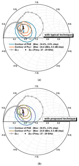 We compared the load-pull characteristics between the cases of applying the typical and the proposed layout techniques. As can be seen in Figure 11, the optimum impedances for the output power and efficiency of the proposed technique are almost similar to those of the typical one. However, the maximum output power and PAE of the proposed technique is higher than those of the typical technique.