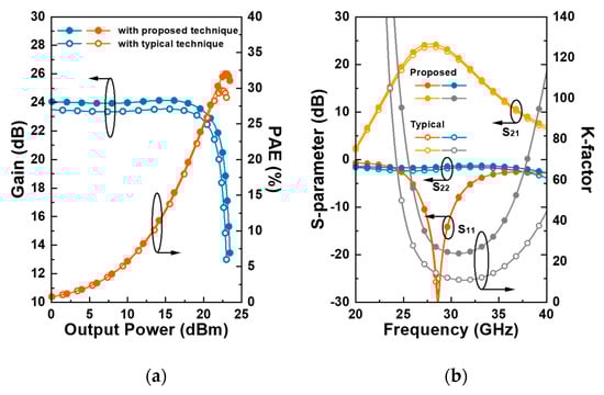 The load-pull result was converted into the power gain and efficiency characteristics according to output power, as illustrated in Figure 12a. The power gain, P1dB, saturation power (Psat), and peak PAE with the proposed layout technique were improved compared to those with typical one. Even if the degree of improvement was not dramatic, all major performance indicators of the PA can be improved by simply dividing the external gate capacitor into two without an additional chip area. Figure 12b shows the simulation results of the S-parameters and k-factor. It can be seen that the S-parameters in the two cases were very similar to each other while the k-factor of the proposed technique was improved compared to the typical technique.
