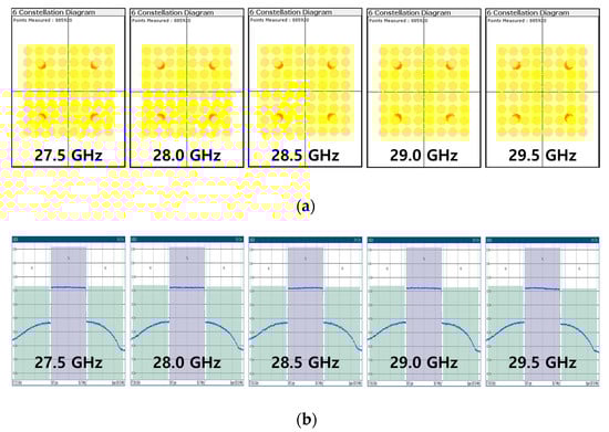 Figure 16 shows the error vector magnitude (EVM) and adjacent channel leakage ratio (ACLR) measured with 64-quadrature amplitude modulation (QAM), 100 MHz bandwidth, and 9.7 dB peak-to-average power ratio (PAPR) 5G new radio (NR) signal, respectively. In Figure 17, we summarized the measured maximum linear POUT and ACLR under the condition that the EVM value was −25 dB. Table 1 shows the performance of the Ka-band CMOS PAs available in the literature.