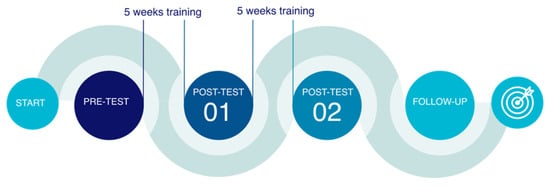 A pre-test, post-test 1, post-test 2 study design was employed, with a group composed of 21 young girls and women with RTT syndrome (Figure 1).