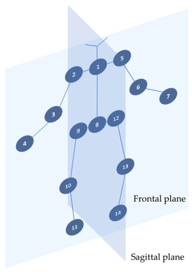 Skeleton model and keypoints used for joint measurements: left shoulder flexion: 1-5-6 (sagittal plane); right shoulder flexion: 1-2-3 (sagittal plane); left shoulder abduction: 1-5-6 (frontal plane); right shoulder abduction 1-2-3 (frontal plane); left elbow flexion: 5-6-7 (sagittal plane); right elbow flexion: 2-3-4 (sagittal plane); left knee extension: 12-13-14 (sagittal plane); right knee extension: 9-10-11 (sagittal plane).
