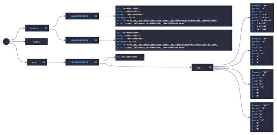 Data were collected during videoconference calls by the local workstation (patient side), composed of a laptop with a connected stereo ZED camera and equipped with our telerehabilitation software. During telerehabilitation sessions, the specialist could remotely instruct the local workstation to record video sequences and text notes without distracting the local caregiver, by typing specific text commands in the video call chat. For example, writing Start recording began the recording event, while Start zed triggered the acquiring of skeleton data. All these annotations were recorded in a JSON file that contained all the session’s data and metadata (see Figure 4). Metadata refers to text annotations, date and time of the session, references to the other session files (video recordings). Data were about the 3D coordinates of the keypoints detected by the ZED OpenPose library during the session.