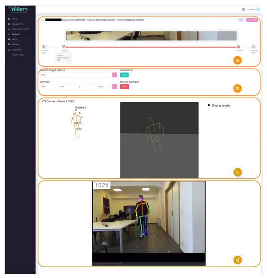 The interface was composed of four sections (named from a to d in Figure 6) and a menu on the left side. In section a, the interface shows some metadata about the therapy session, such as the patient’s name, session ID, and the start and end date and time of the session. Moreover, in section a, there is a timeline that shows a thumbnail of the video recordings and text annotations taken by the therapist during the session, displayed at the correct position in the timeline. Those annotations are also overlayed on the video shown in section d at the correct time.