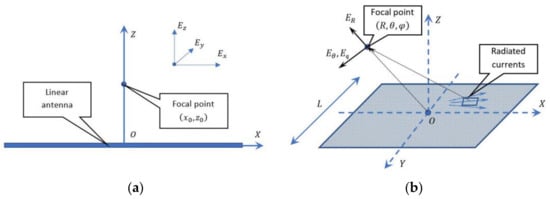 Directional radiation of the antenna in the far-field zone can be interpreted as the result of the in-phase addition (focusing) of electromagnetic waves emitted by individual sections of the aperture in a given direction at distance . Similarly, in the near radiated field zone, focusing to the point means ensuring the in-phase summation of the waves emitted by individual sections of the aperture. The fundamental property of the near radiated field zone is the possibility of three-dimensional focusing (in contrast to the far-field zone, where only two-dimensional focusing is fundamentally realized).