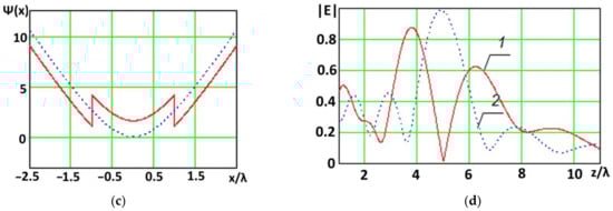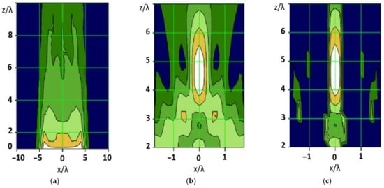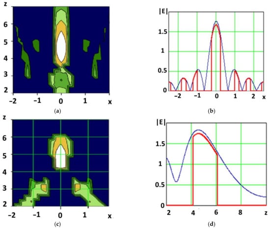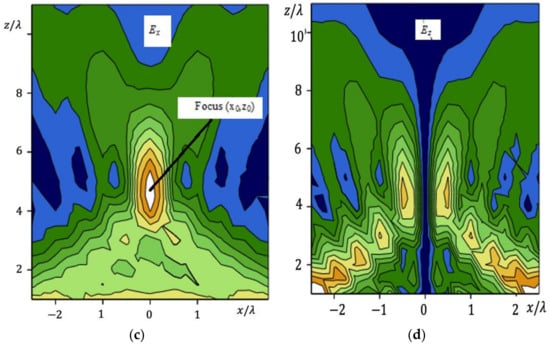 The spatial distribution of the intensity of the electromagnetic field in this case is a pronounced peak, surrounded by bursts of lower intensity, similar to side lobes in the radiation pattern. The effect of the in-phase and close-to-in-phase addition of partial fields is observed only at the focus point and in its immediate vicinity. Outside this neighborhood, the phase relations of partial fields will be random, which leads to bursts of field strengths of varying intensity. When evaluating the focusing effect, one is usually confined to one-dimensional graphs characterizing the distribution of the field strength along the axis parallel to the aperture and that perpendicular to it (Figure 3a,b). In some cases, for a more visual representation of the effect of focusing the electromagnetic field, two-dimensional graphs can be built, for example, such as in Figure 3c,d.