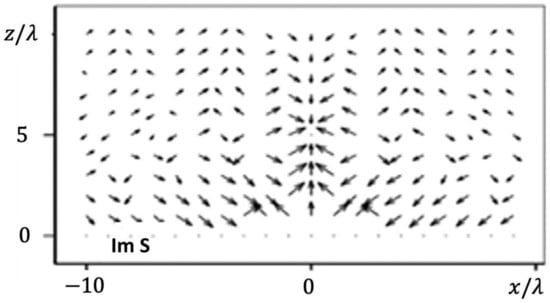 As is known, in the far-field zone, in the vicinity of the radiation pattern maximum, there is a divergent flow of the real part of the Poynting vector, while its imaginary part is practically absent. In the near radiated field zone, the real part of the Poynting vector is a stream converging to a focal point with a subsequent divergence in space of an inhomogeneous spherical wave. The imaginary part of the Poynting vector, which describes the oscillatory movement of power, shows its movement in both the longitudinal and transverse directions (Figure 4 and Figure 5). For the formation of the spatial distributions of the Poynting vector presented in Figure 4 and Figure 5, a uniform distribution of currents in a focused aperture was used.
