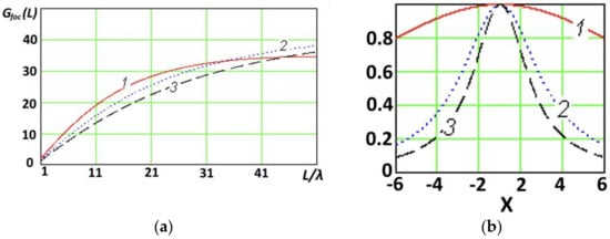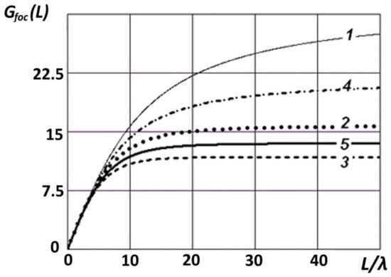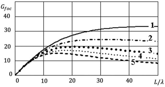 In the near radiated field zone, the value of the gain is always limited. It is limited not by the electric aperture size but by the relative focal length . The value decreases as focal length decreases. On the other hand, increases to a value of , corresponding to the gain in the far-field zone, as focal length . For each value of the relative focal length , there is a maximum achievable value of . In addition, the antenna gain in the near radiated field zone significantly depends on the polarization and shape of the elementary source pattern in the aperture (Figure 6). In this case, an increase in the directivity of the elementary source, as a rule, leads to a decrease in the gain of the focused antennas.