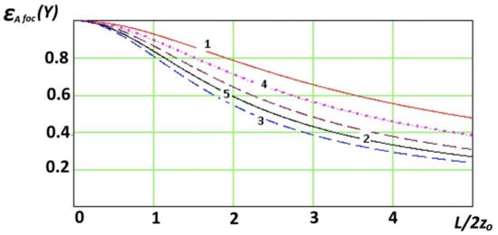 Dependence of on the dimensions of the linear aperture for various polarization and radiation patterns of elementary sources with focusing depth . 1, isotropic emitter oriented across the aperture; 2, isotropic emitter oriented along the aperture; 3, radiation pattern type along the aperture; 4 and 5, emitters in the form of a Huygens element oriented across the aperture and along the aperture.