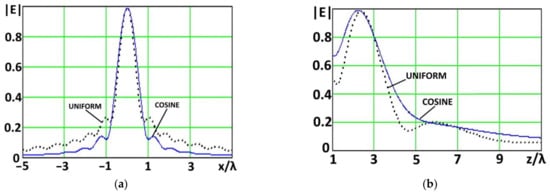 Distribution of the electric field strength module in directions (a) parallel and (b) perpendicular to the aperture for uniform and cosine amplitude distributions , focal length m.