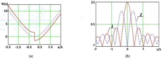 Phase distributions and and the corresponding sum–difference-type radiation patterns formed in planes parallel and perpendicular to the aperture: (a) phase distribution of the first type; (b) sum–difference distribution of the electric field strength in a plane parallel to the aperture: 1—sum radiation pattern, 2—differential radiation pattern; (c) phase distribution of the second type; (d) sum–difference distribution of the electric field strength in a plane parallel to the aperture: 1—sum radiation pattern, 2—differential radiation pattern.