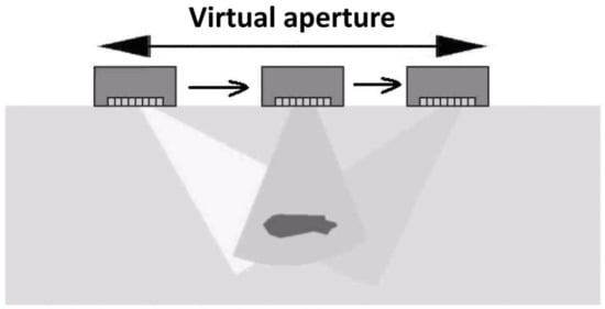 Weighted summation corresponds to focusing at a point , where can take on different values within the field of view. When the probe is moved, the principle of a synthesized aperture is implemented (Figure 17).