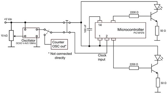 The task of controlling LEDs can be handled by many options including CLPDs [13,14], FPGAs [15,16] or a microcontroller [17,18]. The latter was chosen solely because of previous experience. Microcontrollers have a small footprint, small price, are easy to program and have low power consumption. According to the specification of LEDs, they consume around 64 mW for short periods of time. The OCXO consumes around 400 mW continuously at room temperature [19].