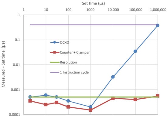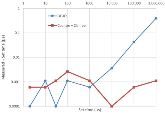 For the first six measurements with the OCXO clock, standard deviation is similar (0.5 ns), e.g., only three to four nearest values were obtained. For the last two measurements, standard deviation increases to 10 ns and 12.6 ns. The reason for this is that the measurement of longer time delays consists of more instruction cycles and the values are significantly above counter resolution and can be detected by measurements. For delay times longer than one second, a proportionally larger difference of measured and set time is expected. Since one second time delay difference in measured and set time is approximately one instruction cycle, it was speculated that there was an error in the code.