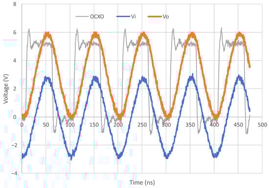 Oscillator signals that were measured with an oscilloscope are presented in Figure 6. The thin grey line shows the signal from the OCXO, and the thicker (blue) line shows the signal from the counter output port, which is fed to the clamper circuit, and the thickest (orange) line shows the signal at the output of clamper circuit.