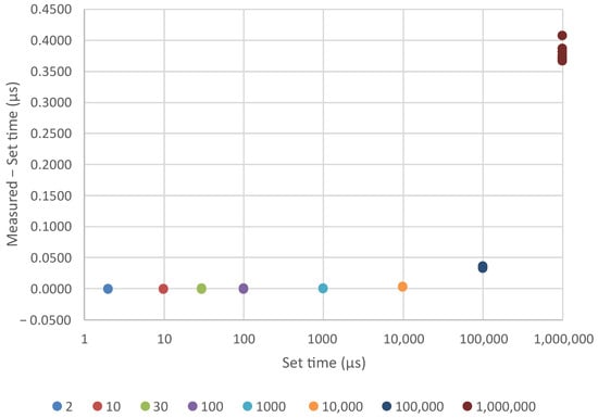 The measurements were repeated, and the results are presented in Table 7 and Figure 4 with a thicker red line. It can be seen from the results that the calculated and measured values are in good agreement, and thus it is verified that the counting of the instruction cycles in the subroutines, and hence the duration, is appropriate, and this makes it possible to obtain a precise time delay.
