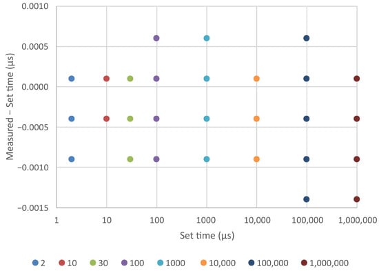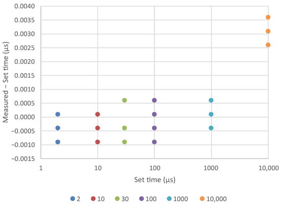 Given that the properties of the OCXO and the reference oscillator in the counter are not equal, the difference between the measured and the set time delay is in the range of noise and under resolution for smaller time delays, and then increases proportionally to the set time and at the highest time delays approaches the microcontroller time resolution of 0.4 µs.