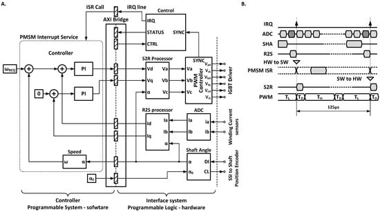 The PMSM controller implementation block diagram is shown in case A of Figure 3. The controller is partitioned into interface system logic and controller computation part. The AXI bridge is a boundary between hardware and software. The interface system logic creates a tightly connected set of hardware peripheral components that implement input and output signals translation for the control algorithm. The input path implements a processing unit R2S (Rotating to Static) that transforms the winding currents of the tri-phase system into static vectors. The inverse transformation is performed in the output path by the S2R (Static to Rotating) computation unit. The S2R module delivers duty factors for the PWN controller for each phase of the inverter. It assures an appropriate relationship between the activity time of transistors separated by dead time gaps. The PWM controller determines the elementary computation cycle using the SYNC signal for initializing input signals acquisition. The windings current is averaged over the elementary period of the inverter using oversampling. This allows for the suppression of switching disturbances of the inverter. The motor shaft angle measurement (SHA) is placed at the end of the operation cycle allowing for obtaining the recent position for measured currents. Finally obtained results are passed to R2S processing and made available along with the activation of the IRQ line. This requests the software-based processing by calling the PMSM interrupt service. The time window for completing computation is almost equal to the inverter’s basic period (125 µs). The software processing results are collected from registers and passed to the S2R processing block. At the same time, the IGBT driver block starts the driving period with a dead time gap. Only 12 clock cycles are required for completing the computations by the S2R unit and delivering driving values for the inverter. The computation cycles of the S2R unit are hidden behind the dead time gap. In the considered implementation, the minimal dead time assuring correct operation is 120 ns while typically it is around several µs [12].