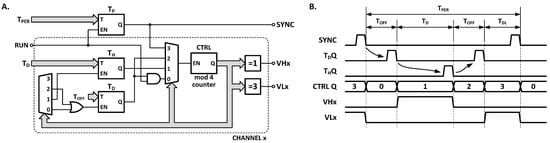 The FPGA device enables the implementation of a complex pulse width modulation system that integrates the synchronous operation of the tri-phase inverter driver system. The simplified block diagram of the synchronization unit and PWM modulator channel is shown in case A of Figure 4. The functional waveforms that illustrate the operations in the control cycle period are shown in case B of Figure 4.