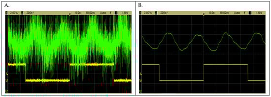 Oscillograms of winding current signal from LEM sensors obtained directly (A) and with 64 samples averaging (B).