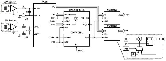 The ZYNQ device is equipped with a compensation analog to digital converter [19]. It can achieve the sampling performance of 1 Ms/s. The exact performance is slightly lower at 100 MHz clock, while the conversion takes 104 clock cycles. The converter performance is enough to take 64 samples over a 125 µs inverter basic period. The block diagram of the averaging integrated converter is shown in Figure 6. The XADC control is completely synchronized with the inverter operation. A set of samples is collected upon request pulse of the RQ signal. The value of collected signal samples is accumulated since the beginning of the measurement cycle as shown by (2).