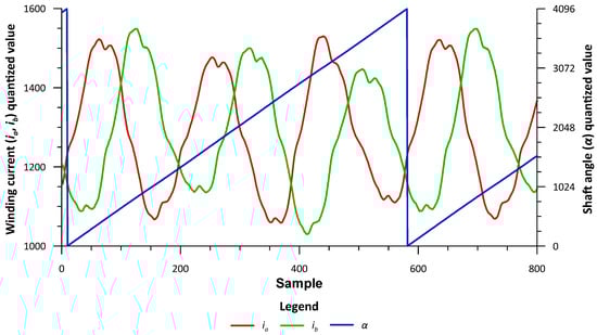 The winding currents obtained using the proposed averaging method and acquired shaft angle are shown in Figure 8. Comparing oscillograms from Figure 5 and winding currents there could be observed switching noise elimination. The method can be compared to dual integration voltmeters where the input signal measurement is done over the period (or its integer multiplicity) of the disturbing signal. This results in eliminating the noises coming from the inverter’s IGBT switching.