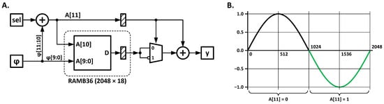 The problem is overcome in the proposed implementation shown in Figure 10 by storing the sine function samples in the range (case B–black line). This allows the reduction of memory requirements only by half but eliminates the problem of additional hardware necessary for accessing the odd number of memory cells. Case A of Figure 10 illustrates the implementation of a universal sine and cosine function generator. The hatched rectangles denote the registers in the signal paths. The implementation with the required angle resolution is possible using the RAMB36 module [23] which can hold 2048 18-bit words. The output of the lookup table is passed to an adder that depending on the value of the MSB of the angle complements or passes simple content of the memory cell. In order to balance the registered delay of the memory block the register is placed on the A11 line to synchronize it with data arriving from the memory. In order to use the same lookup table for obtaining the sine and cosine functions the indexed addressing concept is used. The function selector (sel input) is considered as a two-bit offset added to the high-order bits of the angle φ. This two-bit vector when considered as the natural number introduces an angle shift inside the address word: .