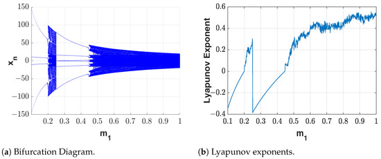 Figure 2b displays the calculation of the Lyapunov exponents of map (1) by taking values of in the closed interval , and the initial condition . As can be corroborated in this plot, the Lyapunov exponent is non-positive in the same intervals where periodic dynamics were obtained in the bifurcation diagram, i.e., in the intervals where and , and is positive for the intervals: and . Given that the orbits in each of these two intervals are bounded and , then chaos is present in each of them.