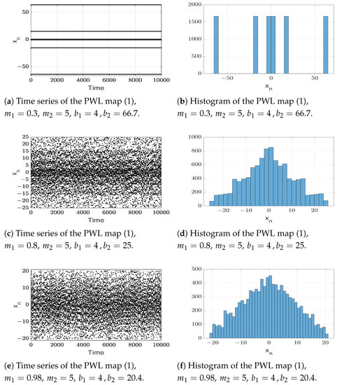 For Matlab, the data test volume was 10 0000 iterations for each set of parameters shown in Figure 3 and the same initial condition (Matlab makes the calculations using floating point arithmetic according to the standards of the IEEE). In Figure 3, we can appreciate the time series and histograms for the three different maps. We can observe that as in Figure 2, there is a chaotic behavior for the values present in Figure 3c,e, while for the parameters in Figure 3a, there is periodic behavior. Furthermore, the striped structure obtained in Figure 3c occurs because there are bars that are close together with a frequency close to each other, as shown in the histogram in Figure 3d. As the value of increases, the distribution of values is concentrated closer to and the stripe width is thinner (see Figure 3e,f).