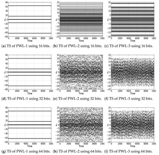 Figure 5 displays the time series (TS) for the same three PWL employed on simulation made with Matlab but now obtained by simulating it in the C language using fixed-point arithmetic with three distinct architectures. For the PWL simulation using C language, we also calculate 100,000 iterations, and an initial condition . For the three maps it was taken ; for PWL-1, ; for PWL-2, ; for PWL-3,