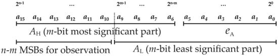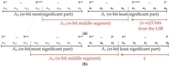 In this case, two control flags are required for the selection, named αAH and αAM in the following. Therefore, defining αAH as the OR of the first (n − m)/2 MSBs of A (i.e., a15, a14, …, a12, highlighted in blue in Figure 3a), and αAM as the OR of the remaining (n − m)/2 MSBs (i.e., a11, a10, …, a8, highlighted in green in Figure 3a), the segment Aessm is computed as