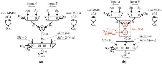 Figure 2a depicts the hardware implementation of the SSM multiplier. The multiplexers on A and B apply the segmentation choosing between the most significant and least significant portions of the inputs, whereas two OR gates compute the selection flags αA and αB. After the m × m multiplier, a further multiplexer realizes the left-shift described in (4).