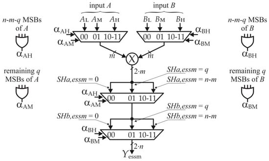 The selection flag αAH is computed by OR-ing the first n – (m + q) MSBs of A (i.e., a15, a14, a13 in Figure 3b, depicted in blue), whereas αAM is computed by OR-ing the remaining q MSBs (i.e., a12, a11, …, a8 in Figure 3b, depicted in green). Then, the segmented inputs Aessm, Bessm are computed as in (8), with the following expressions for SHa,essm, SHb,ssm: