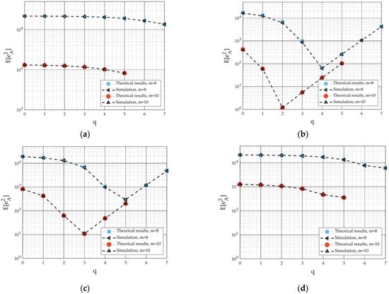 As shown, the theoretical results perfectly match with the simulations. For fixed m, increasing q decreases E[e2A] in the uniform case. Therefore, the optimal point qopt, able to minimize E[e2A], is the maximum value of q (that is qopt = n − m − 1). On the other hand, E[e2A] shows minima in Figure 5b,c, with optimal points in qopt = 4, m = 8 and qopt = 2, m = 10 for σ=1024, and qopt = 5, m = 8 and qopt = 3, m = 10 for σ = 2048. When σ becomes large, E[e2A] again decreases with q, making q = n − m − 1 the best choice.