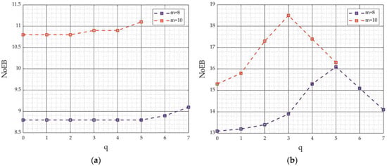 NoEB with respect to q for m = 8 and m = 10 for (a) uniform distributed inputs and for (b) half-normal distributed inputs (with σ = 2048). The number of bits of the inputs is n = 16.