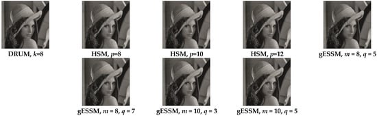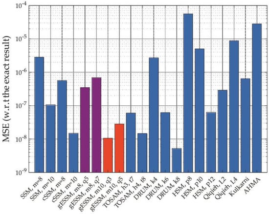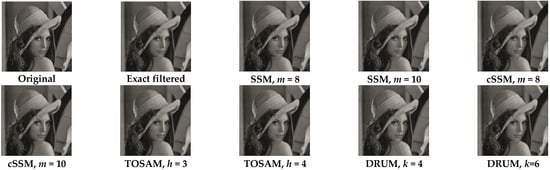 Figure 10 shows the performances, with multiplications revisited as sign-magnitude operations. The results for the gESSM multipliers are highlighted in violet (m = 8) and in red (m = 10). As shown, the accuracy of the gESSM again varies in dependence on q, with best performance achieved with q = 3, m = 10. In this application, gESSM overcomes cSSM both with m = 8 and m = 10, which offer a worse MSE. In general, the gESSM performs better than the other implementations, with the exception of DRUM k = 8, featuring the best accuracy in this case.