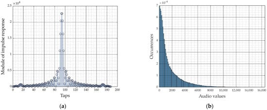 (a) Module of the impulse response of the low-pass FIR filter and (b) histogram of occurrences of the audio signal.