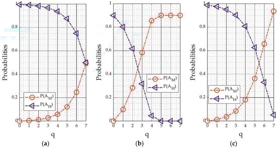 Figure 11 shows the behavior of P(AM) and P(AH) with respect to q for m = 8, in the uniform case and in the half-normal distribution with σ = 2048 and σ = 16,384. We remember that the analytical expressions of P(AM) and P(AH) are shown in Table 3.