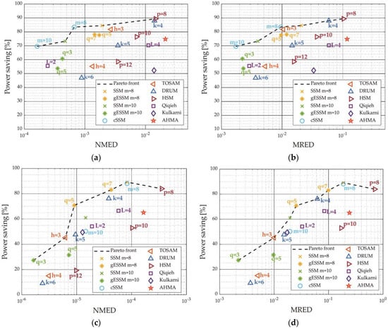 In the case of uniform distribution: (a) NMED vs. Power saving and (b) MRED vs. Power saving. In the case of half-normal distribution (σ = 2048): (c) NMED vs. Power saving and (d) MRED vs. Power saving.