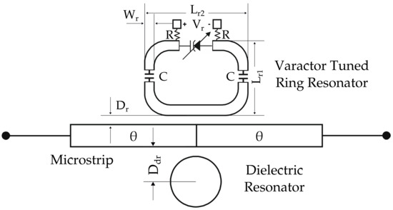 Schematic structure of the electronically tuneable DR band-stop filter, along with its main geometric dimensions.