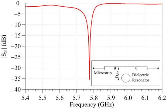 The first step of the design procedure was the design of the DR band-stop filter, which began with the identification of a DR exhibiting a resonance at the central frequency of 5.8 GHz. For this purpose, a DR was selected with the following characteristics (Exxelia E4000 series): height 5 mm, diameter 11 mm, relative dielectric constant , and unloaded Q factor of about 15,000 at 10 GHz. The performance of the resulting DR-based filter within the cavity, optimized in accordance with the procedure described in [17], is reported in Figure 2. The insertion loss at 5.8 GHz was 36.5 dB, while at 5.9 GHz, it was 0.6 dB; the optimal value of about mm was found.