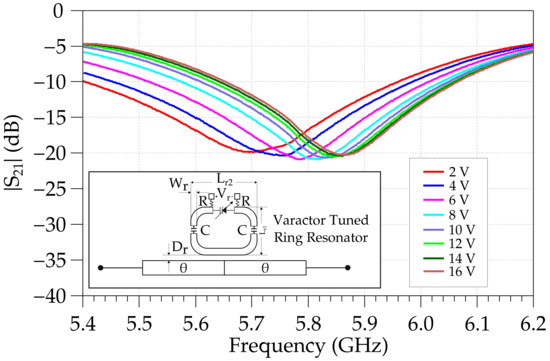 The second step consisted of designing the tuneable ring resonator at the reference frequency. This was based on a microstrip ring with length equal to the wavelength at the central frequency, interrupted by the varactor and decoupling capacitor pair. Figure 3 reports the measured performance of the latter at different varactor bias voltage levels. The filter showed relatively poorer Q-factor performance, while it was optimized to maximize its tuning range, which was from 5.68 to 5.86 GHz. The resulting optimal values were: mm, mm, mm, and mm.