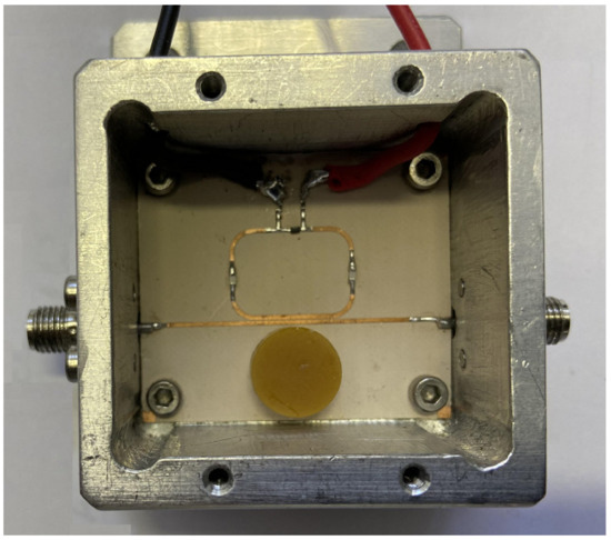 In the literature, some techniques for the voltage control of a -based band-stop filter have been proposed, suggesting, however, complex topologies and designs, such as in [14,15,16,17]. In particular, the tuneability of by means of a varactor was demonstrated in different technologies [18,19], although their involvement in band-stop filters was reported in a lower microwave frequency band and while implementing nonplanar control technologies [17]. In [20], the authors effectively adopted a microstrip resonator tuned by a varactor pair to adjust the resonance frequency of a band-stop filter; nevertheless, their implementation involved two or more DRs to obtain tuneability and selectivity.
