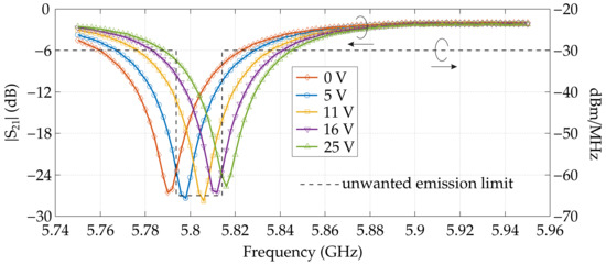 A picture of the varactor-tuned DR band-stop filter prototype resulting from the proposed design procedure is shown in Figure 4, and Figure 5 reports its characterization achieved by a calibrated vector network analyzer across the bandwidth of 5.75–5.95 GHz, with control bias spanning from 0 to 25 V. The same graph reports the unwanted transmitter emission limits for the ITS frequency band [13]. Transmission parameter exhibited a tuned frequency response band-stop depth in excess of −25 dB within the frequency tuning range spanning from 5.794 to 5.814 GHz (20 MHz). The measured maximal insertion loss at 5.9 GHz was 1.6 dB.