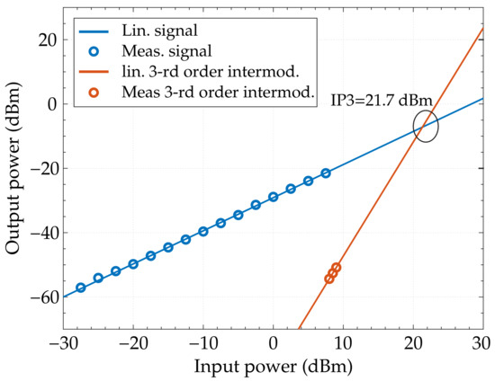 The calculated polynomial showed, for the first-order and third-order coefficients the values of = and = , respectively. This led to a calculated linear of about 13.08 that translated into a dB lead to a = 22.3 dBm, while the measured one was 21.7 dBm.