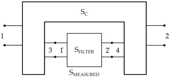 In accordance with the general technique of DR-based band-stop filters, these operate embedded in a cavity implemented by a metal box, along with the interconnecting transmission lines (of electrical length , cf. Figure 1). Thus, the first step of the equivalent circuit model extraction requires a de-embedding procedure in order to completely remove the interaction between the metal box and the DR, and the feeding microstrip connecting the filter with the connectors; all these parts were included in the 4 × 4 scattering matrix ; cf. Figure 9. We extracted the matrix with a full-wave 3D electromagnetic simulation further validated by calibration procedures; cf. Figure 10.