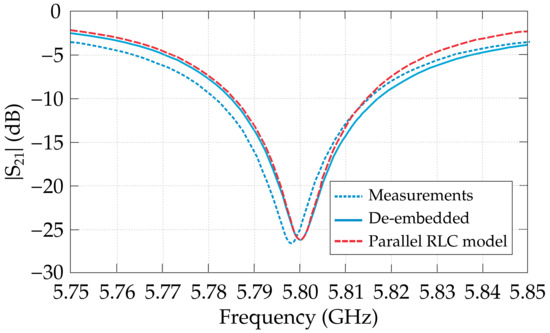 Figure 11 shows a comparison between the frequency response of the equivalent parallel RLC circuit, calculated at V, and the corresponding experimental data. We can see the accuracy of the model in predicting the de-embedded filter response, especially in the vicinity of the resonance frequency, thus validating the proposed modeling and analysis.